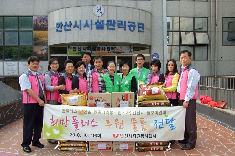 10월 19일, 안산시 성포동 소재 삼성홈플러스(안산점) ‘한울타리봉사단’ 회원들이 그동안 십시일반 기금을 모아 조성한 후원금(60만원)으로 (사)안산시돌보미연대에게 쌀 20포대와 라면 10상자를 전달했다.