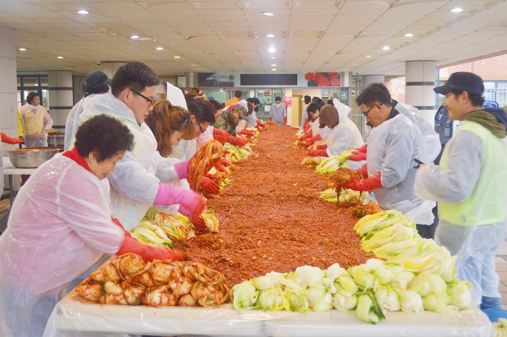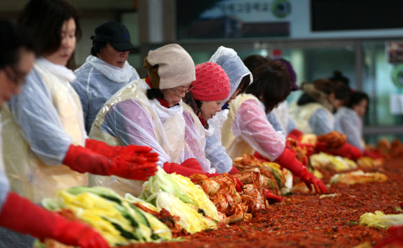 28일 오전 경기도 안산시 단원구 단원고등학교에서 단원고운영위원회와 사단법인 안산시돌보미연대의 사랑의 김장 나누기 행사가 열려 단원고 학부모와 자원 봉사자들이 김장 김치를 담그고 있다. 이날 담근 1200 포기의 김장 김치는 세월호 유가족과 저소득층 가구에 10㎏씩 전달된다.