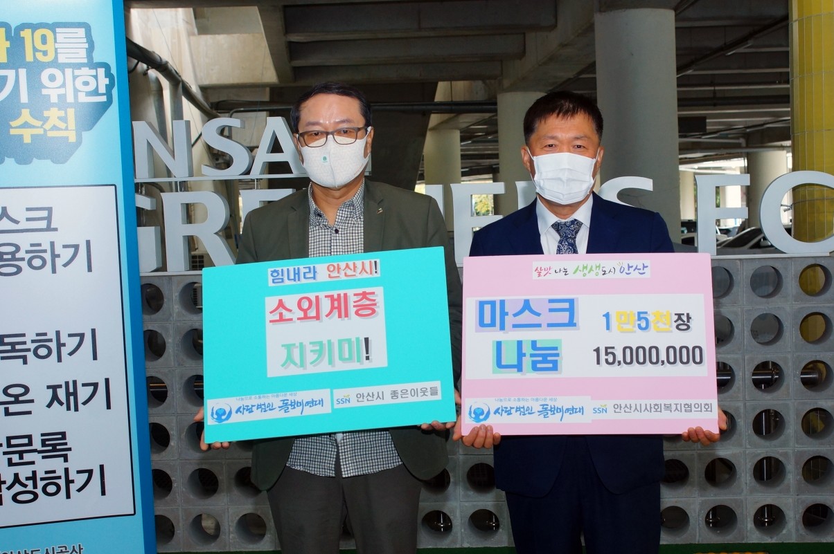 사) 돌보미연대(이사장 이종길)가 2020년 10월 21일, 국내 마스크 생산업체 ㈜에스와이 인더스트리로부터 후원받은 3중필더 국산 마스크 15,000장을 안산시 사회복지협의회(회장 강기태)에 전달했다.