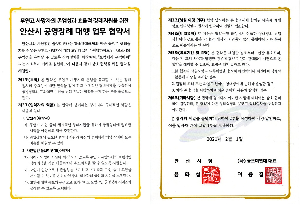협약기관단체 안산시 공영장례 대행기관 협약 페이지 정보 작성자운영자 댓글 0건 조회Hit 4,646회 작성일Date 21-02-25 13:46 본문 안산시 공영장례대행 업무협약서 체결했습니다. 목록 다음글안산시 한도병원장례식장과 업무협약 20.04.14 댓글목록 댓글목록 등록된 댓글이 없습니다.